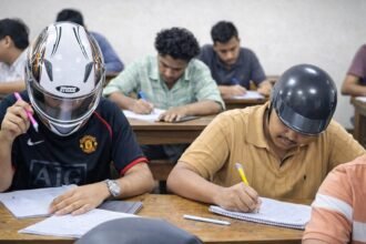 জগন্নাথ বিশ্ববিদ্যালয়ে (জবি) হেলমেট পরে পরীক্ষার হলে শিক্ষার্থীরা